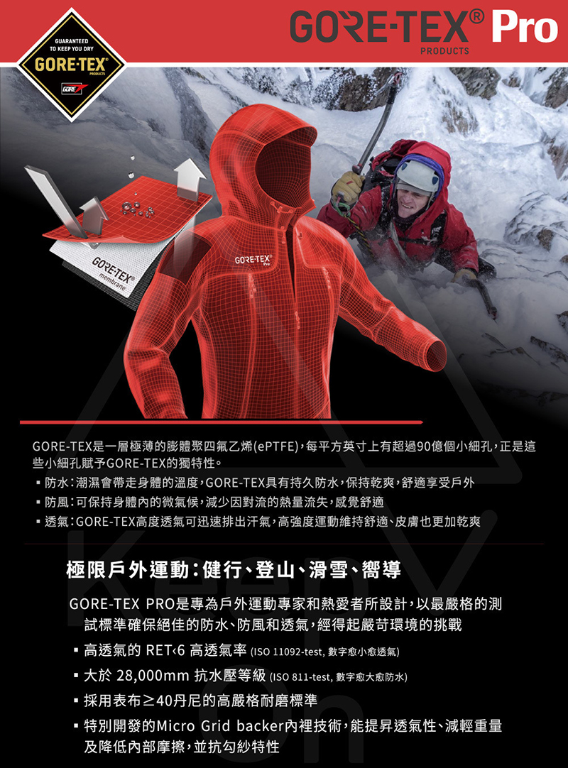 .GORE-TEX PRO是專為户外運動專家和熱愛者所設計,以最嚴格的測試標準確保絕佳的防水、防風和透氣,經得起嚴苛環境的挑戰
