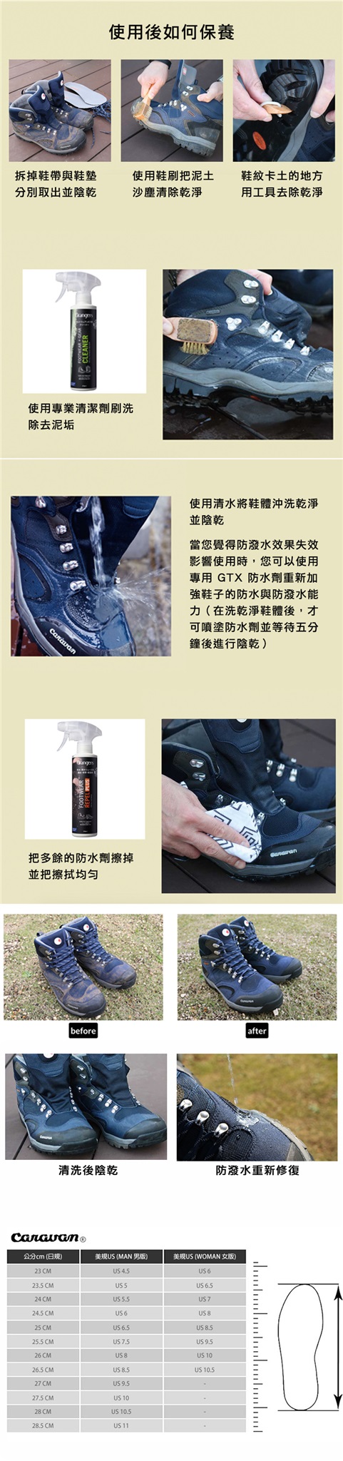 日本Caravan"追求舒適穿著感為使命,不斷進化為宗旨",在1956年5月9日,日本攀山隊首次登上了喜馬拉雅巨峰馬納斯魯,當時登頂隊員所穿的登山鞋正是Caravan Shose,如今Caravan繼承了"輕便好穿又好走"的使命,對於攀登日本地區富士山以及中級山,郊山....等多種需求,Caravan具有足夠的強度,並同時開發適用於初學者的鞋款,讓初學者一穿就上手。