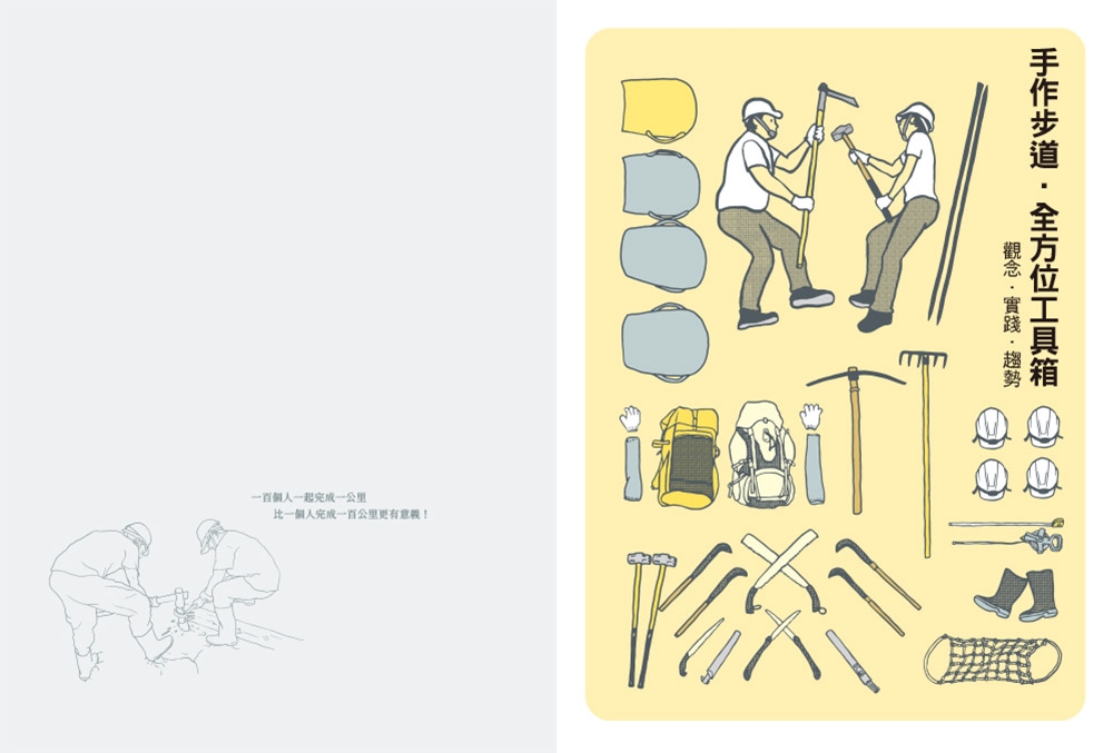 本書作者為長期守護山林的台灣千里步道協會,提倡「天然步道零損失,水泥步道零成長」,十多年來努力推動「手作步道」的實作與工作假期——由於台灣的步道密集且發達,面對步道工程化、水泥化、棲地劣化等危機,強調以「手作」「就地取材」維護步道,儘量避免大型機具、外來材料對山林造成過多擾動;以「手」為限制,也能避免單一、快速與粗糙的步道工程對大自然帶來無法回復的傷害;而且鼓勵公民參與,人人皆可擔任志工學習實作!