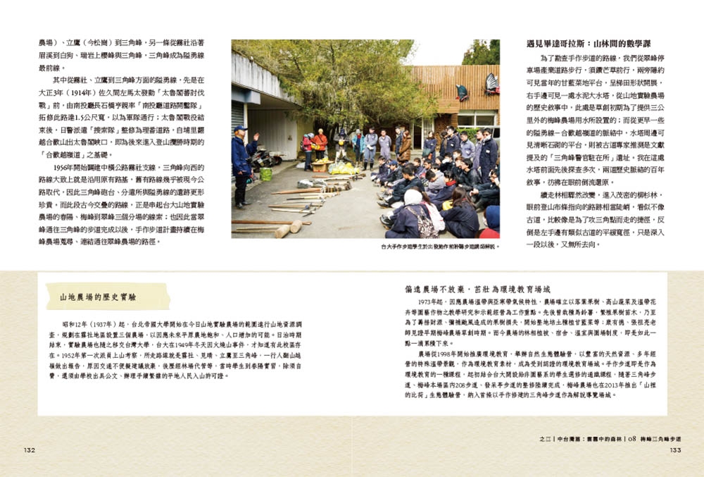 ◎位於中台灣的台灣大學山地實驗農場,連結了春陽、梅峰與翠峰的歷史線路,從賽德克族的獵徑社路到隘勇線、合歡越,跨越百年時間尺度,學生們寒暑接力、齊心修復。