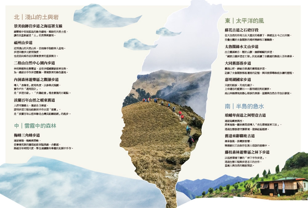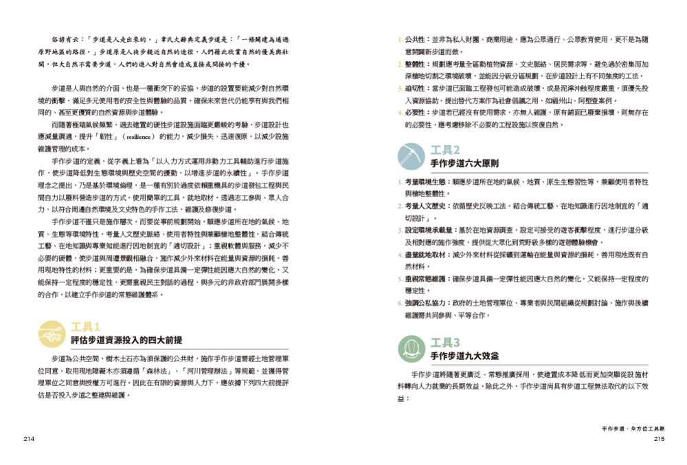 特別收錄【手作步道・全方位工具箱】,從觀念、規劃到實踐,提供與自然共生的最佳導引;並與國際同步,完整引介國際間最新的步道運動趨勢: