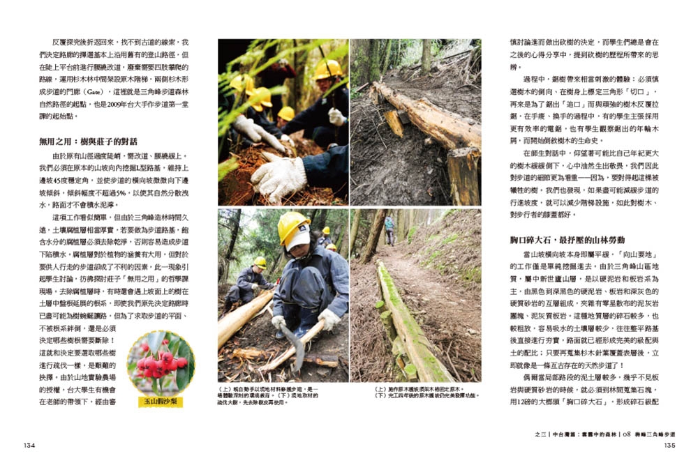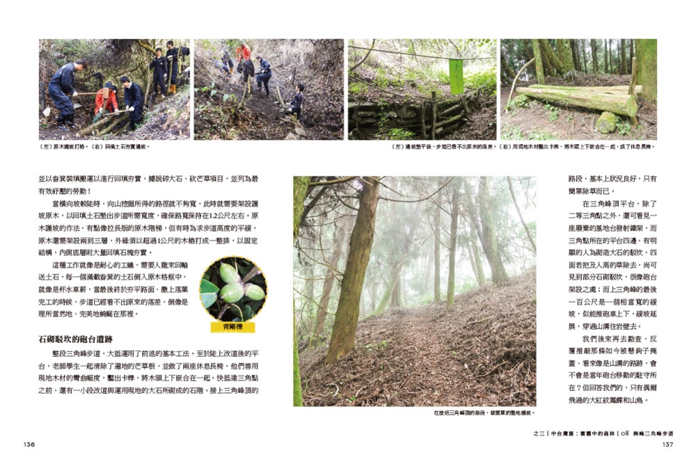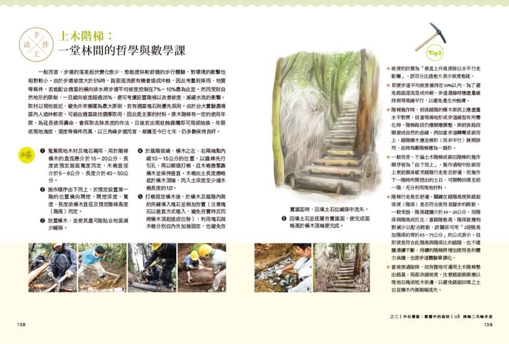 本書從全台灣以手作工法修築的步道之中,精選出13條位於不同區域、海拔環境,並各具獨特性格、工法特色的最美手作步道,透過第一手深度描繪,並以手繪方式圖解步道上的精湛工法,帶你領略天人合一、大隱無形之美: