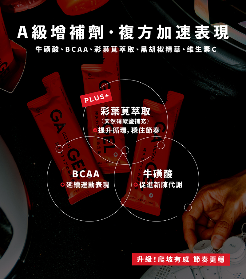 ・A級增補劑!複方才高效:添加天然硝酸鹽(彩葉莧萃取)、牛磺酸、BCAA、黑胡椒精華、維生素C,幫助增強體力耐力,提升整體運動表現。