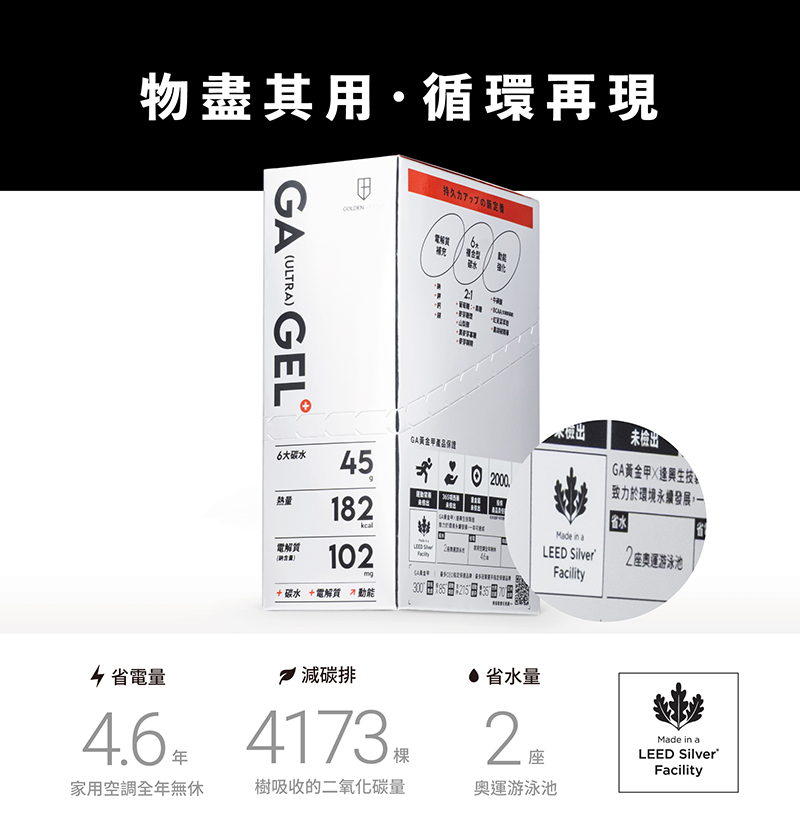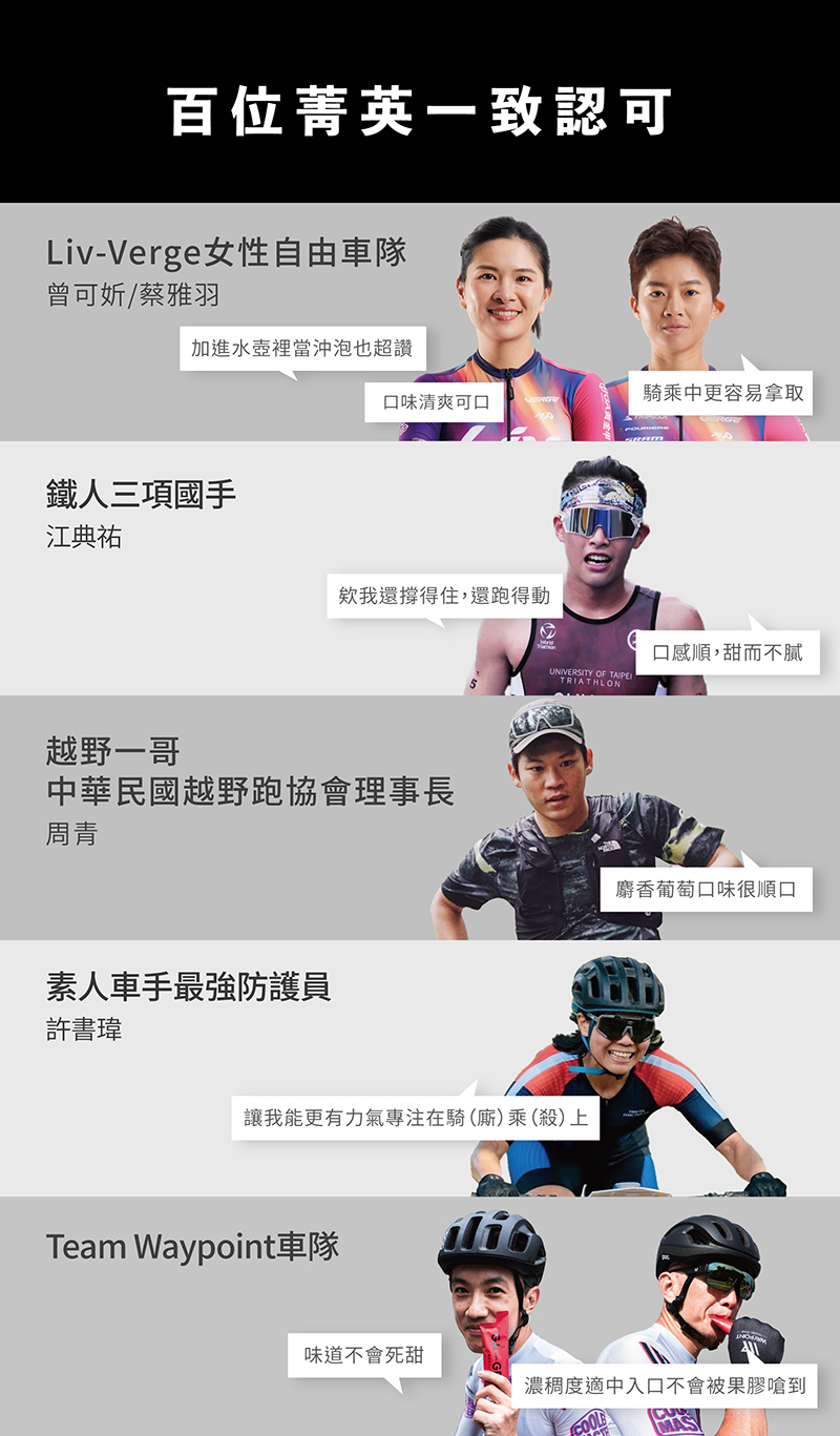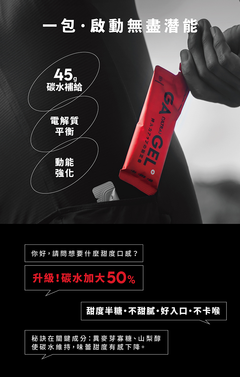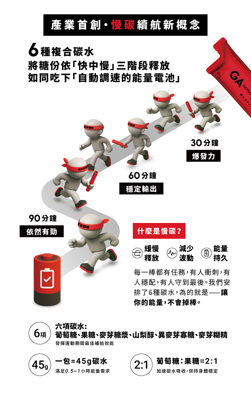 ・產業首創!慢碳新概念 :六大複合型碳水,易消化,吸收效率更佳,進而提供續航持久的能量供應。
