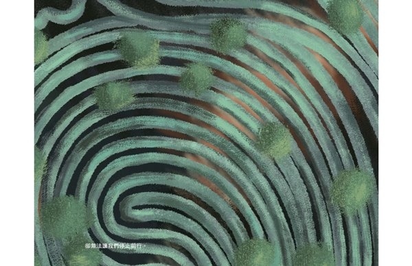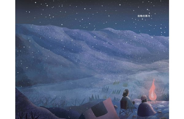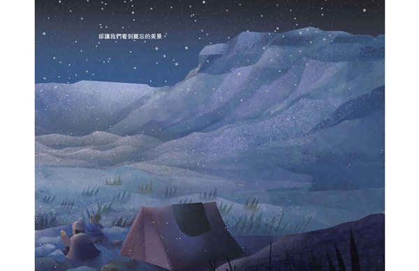 我相信山是時間最好的見證者。寂靜的地形蘊藏了地殼抬升與冰河切割的劇烈故事,正如人在歲月裡留下的傷口與紋理。翻到「夜晚的寒冷」的頁面,螢光藍雪地與紫灰天空像極了挫敗期的無聲吶喊;轉入「暴風雨來臨」的頁面,大片留白與斜向線條營造強風,提醒我們:真正的陪伴不在風景美麗,而在願意一起面對變天。