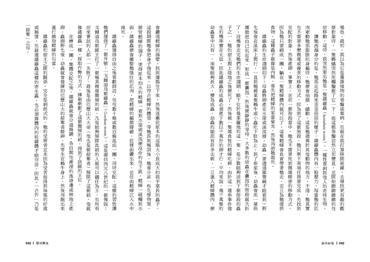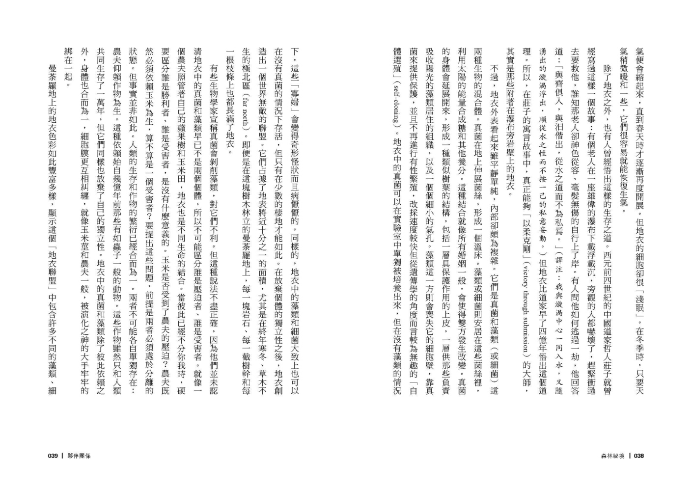 這讓我想起我曾讀過的兩本翻譯到台灣的,同樣是書寫森林的優秀自然書寫作品,一是大衛.弗斯特所寫的《康考特牧歌》,二是鈴木大衛(David Suzuki)與偉恩.葛拉帝(Wayne Grady)所寫的《樹──一棵花旗松的故事》。前者是作者重返梭羅的華騰湖,並以梭羅的文字紀錄與他此刻所觀察到的地景變貌對照,寫出一部新英格蘭地區的自然史;後者則是藉由花旗松(較正式的名稱是「西部黃杉」〔Douglas-fir〕)這個物種,以倒敘的寫作手法,像年輪一樣回溯到植物演化的最初,並穿插它與白蟻、螞蟻、蠑螈、北美黑啄木、白頭海鵰、飛鼠、貓頭鷹、美洲虎、狼……,乃至於文學、藝術、族群史、科學史的複雜故事。