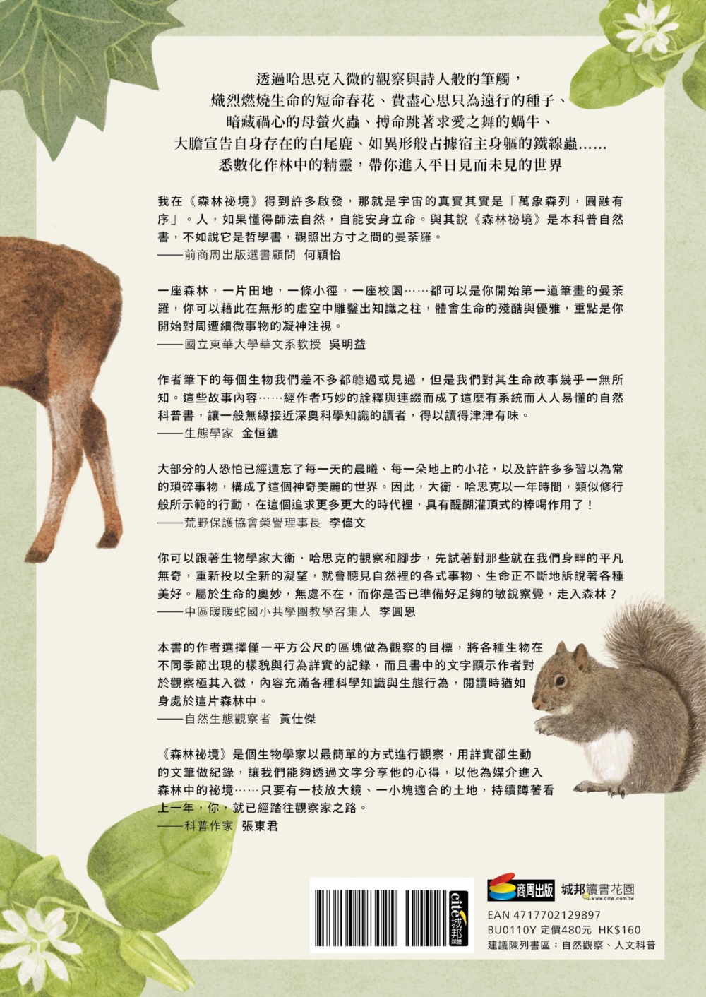 《森林祕境》是個生物學家以最簡單的方式進行觀察,用詳實卻生動的文筆做紀錄,讓我們能夠透過文字分享他的心得,以他為媒介進入森林中的祕境……只要有一枝放大鏡、一小塊適合的土地,持續蹲著看上一年,你,就已經踏往觀察家之路。――科普作家 張東君
