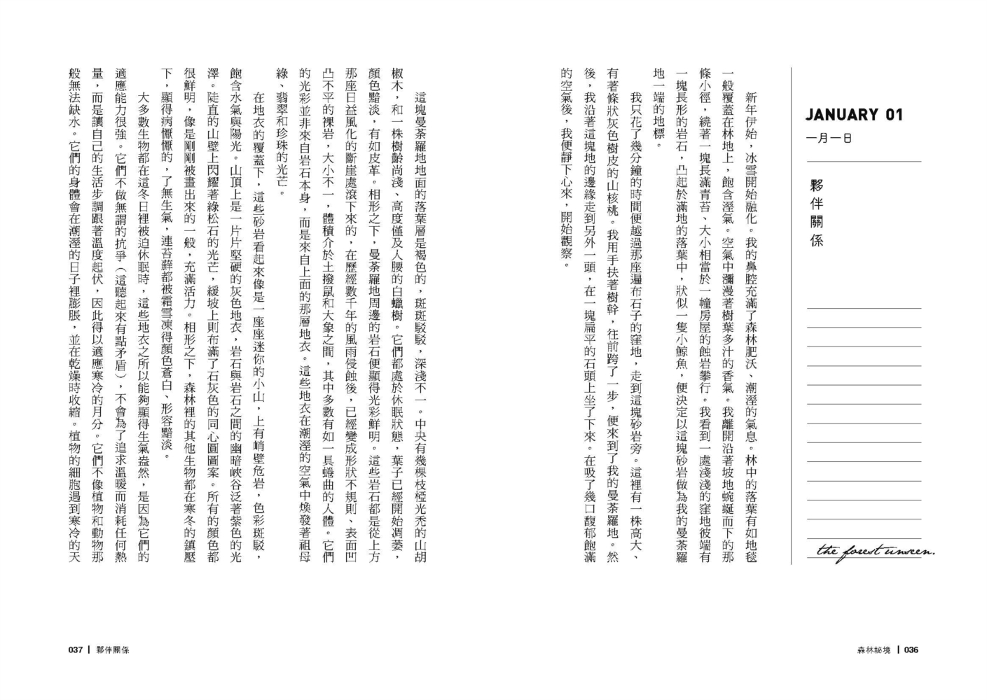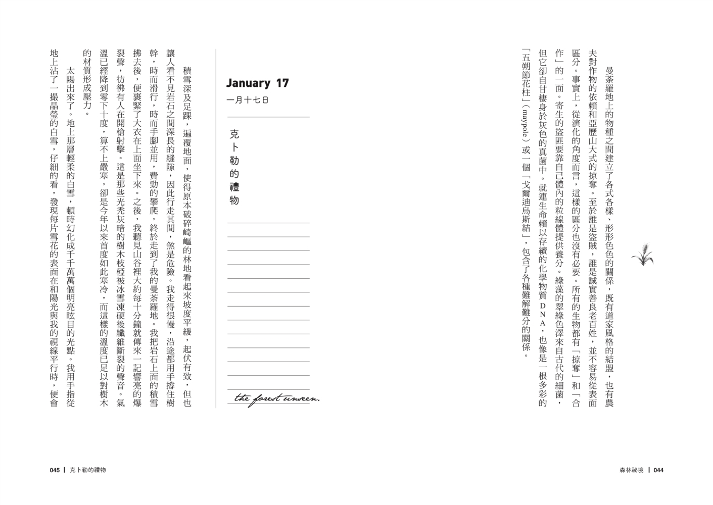 《森林祕境》很像是這兩本書手法的綜合,再加上哈思克豐富的學識、踏實的資料搜集,以及冷靜、精準,情感豐富的文字,透過附加主題的日誌形式,成為一本分量十足,卻又易讀的絕妙作品。它既有磅礡大氣,也常常聚焦微景:不論是北美狼為何絕跡,蠑螈特化的皮膚,植物如何把數噸的水運到樹冠,蕨類如何受精……在哈思克的筆下,總讓我像踏進森林的腐植層裡似的,深深吸住我的閱讀腳步。