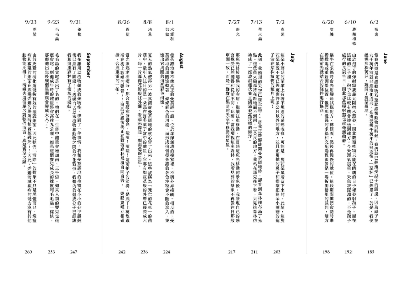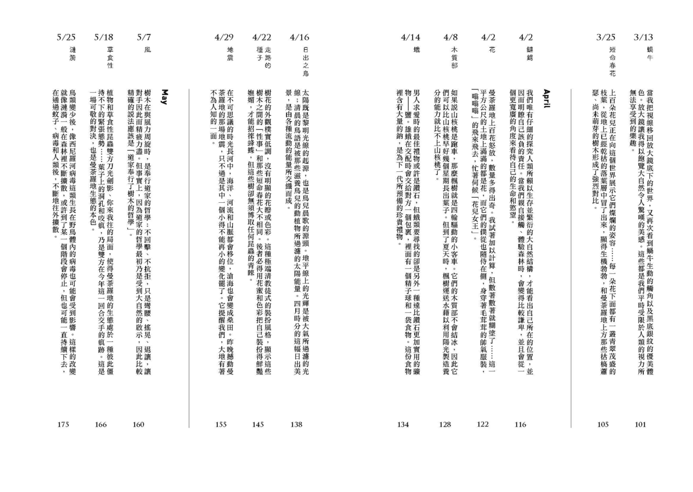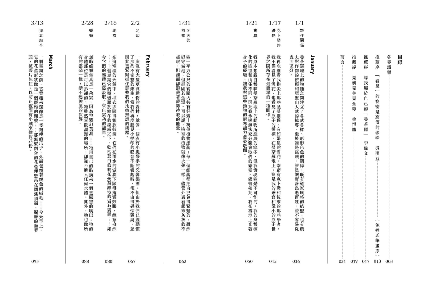 這種對於一個小區域的長期定點觀察,正是荒野保護協會這二十年來所推動的「找自己的祕密花園」行動,不過,令人佩服的是,作者居然只在一公尺直徑區域裡做紀錄,若非具有自然學家背景以及深厚的哲學思考,是很難做到的。