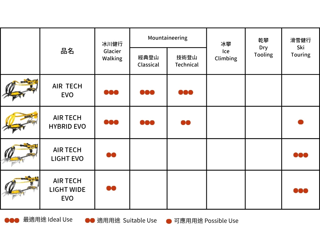 .卓越適配性:無論是冰雪、岩石還是混合地形,Air Tech 都能完美貼合登山靴,成為您在山區活動中的可靠夥伴。