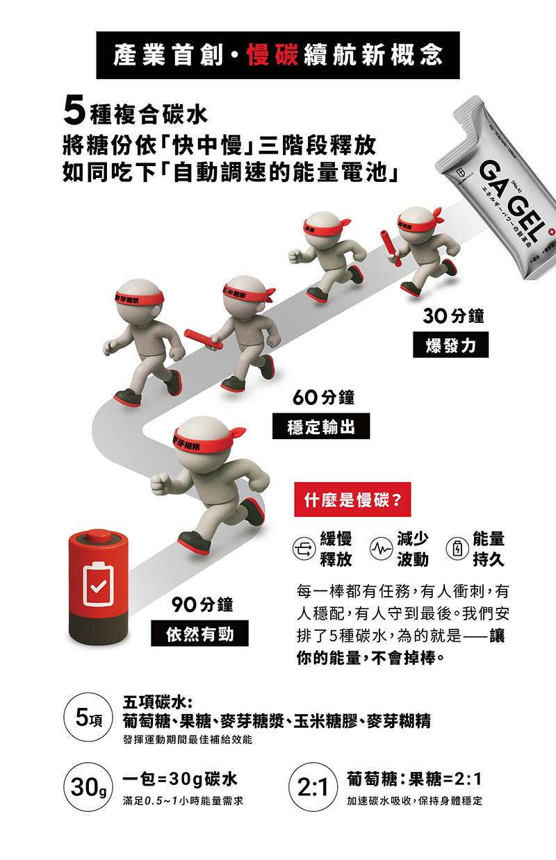 ・產業首創!慢碳新概念-五大複合型碳水:易消化,吸收效率更佳,進而提供穩定持久的能量供應。