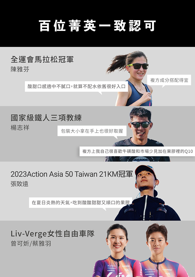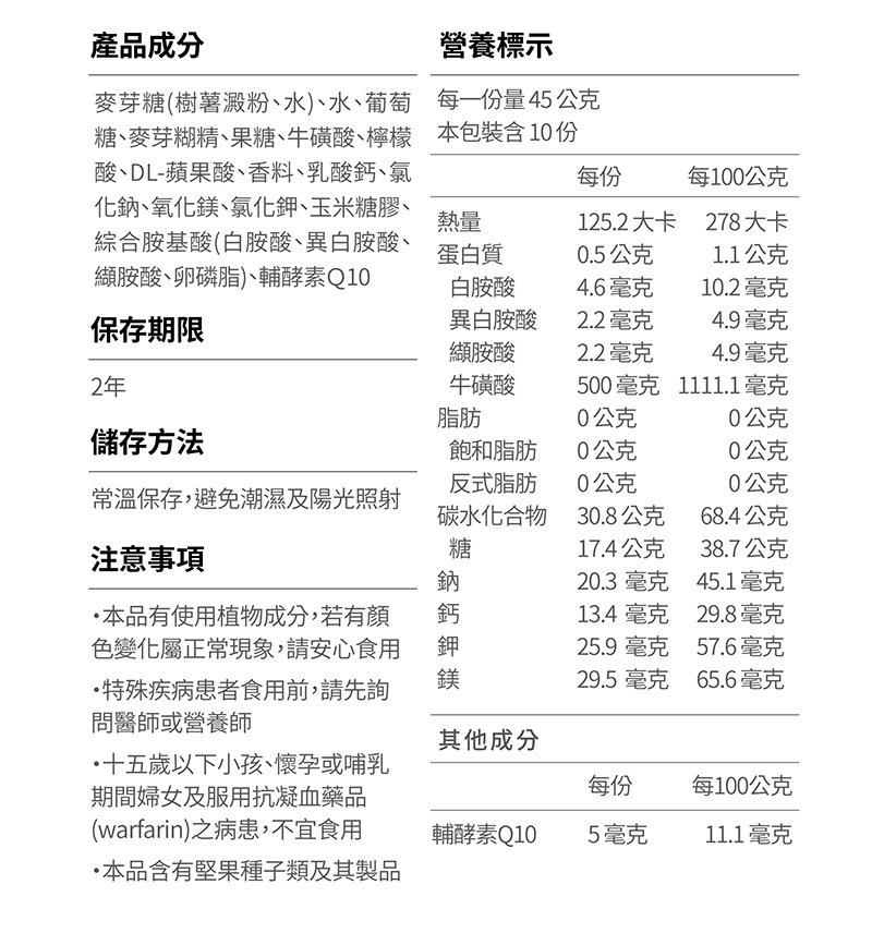 ・添加牛磺酸、BCAA及輔酶Q10:幫助增強體力耐力,提升整體運動表現。