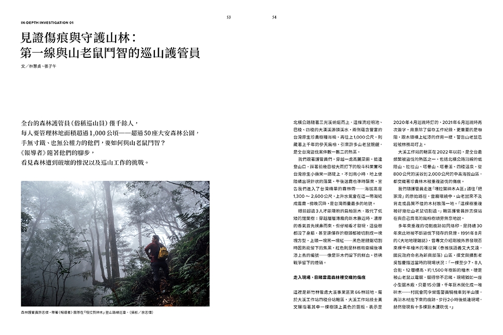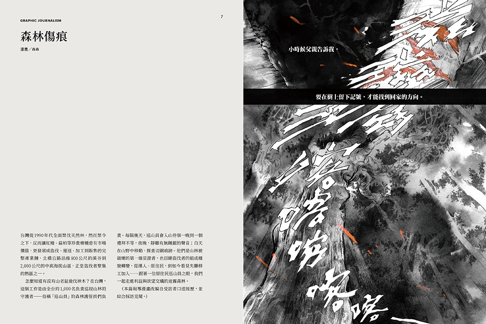 2023年的此刻,台灣全面禁伐滿30年,為了讓讀者能身歷其境感受山林深處發生的危機,我們與漫畫家森森合作,根據報導的第一手素材改編為全新的「報導漫畫」,並收錄完整專題的文字內容以及攝影圖輯。被聖化的「神木」像是某種中介,交織出關於生存與暴利、審美與罪行的多重世界,讓我們就先隨著一位原住民巡山員眼中的森林開始吧!