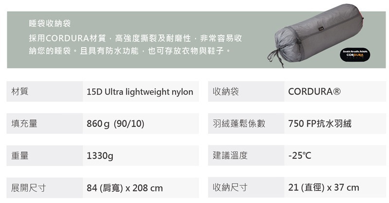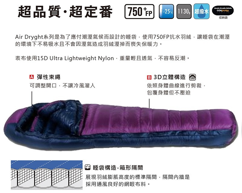 .使用750FP抗水羽絨,讓睡袋在潮溼的環境下不易吸水且不會因溼氣造成羽絨溼掉而喪失保暖力
